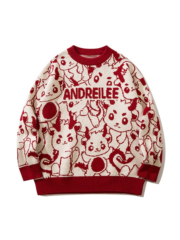 All Over Cartoon Jacquard Crew Neck Knit Sweater