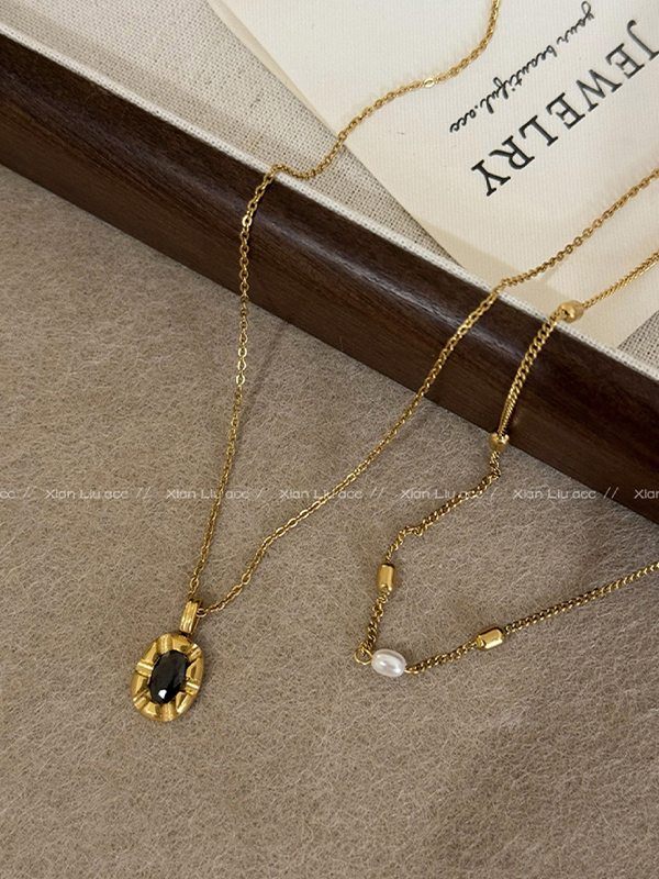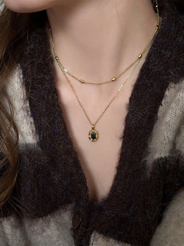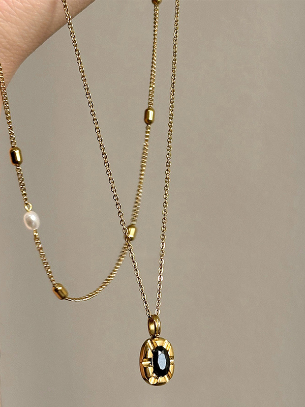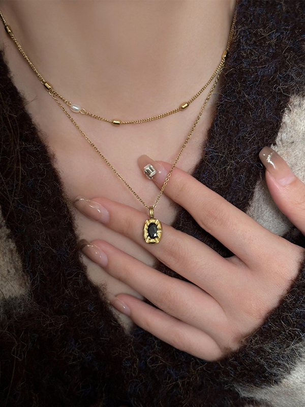 Black Zircon Pendant Pearl Stacked Design Necklace