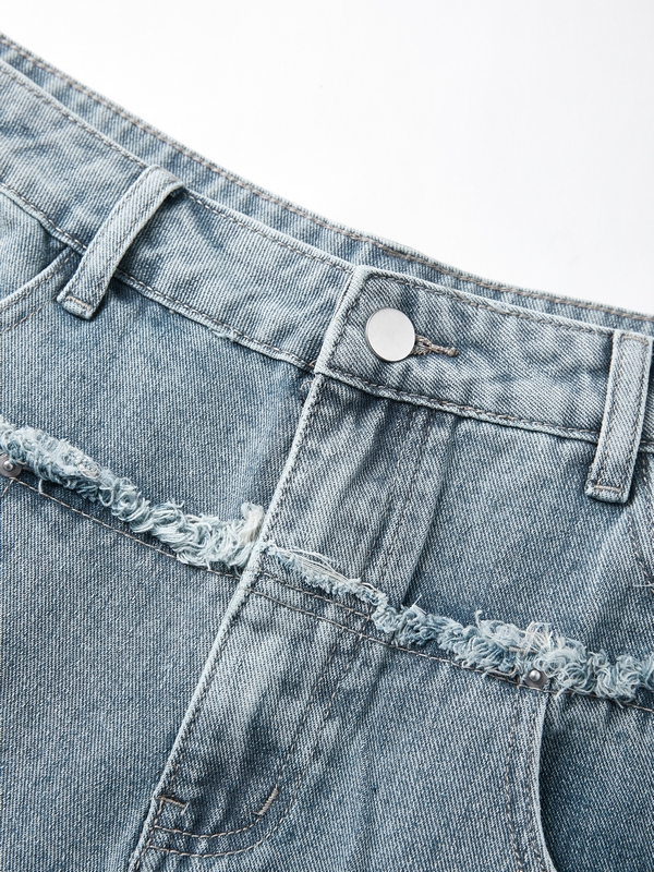 Description: These faded wash denim loose jeans for mens shaped to a skater-leg silhouette, they have patchwork leg with raw cut trims design, features a logo embroidered, and with functional jeans pockets detailing.