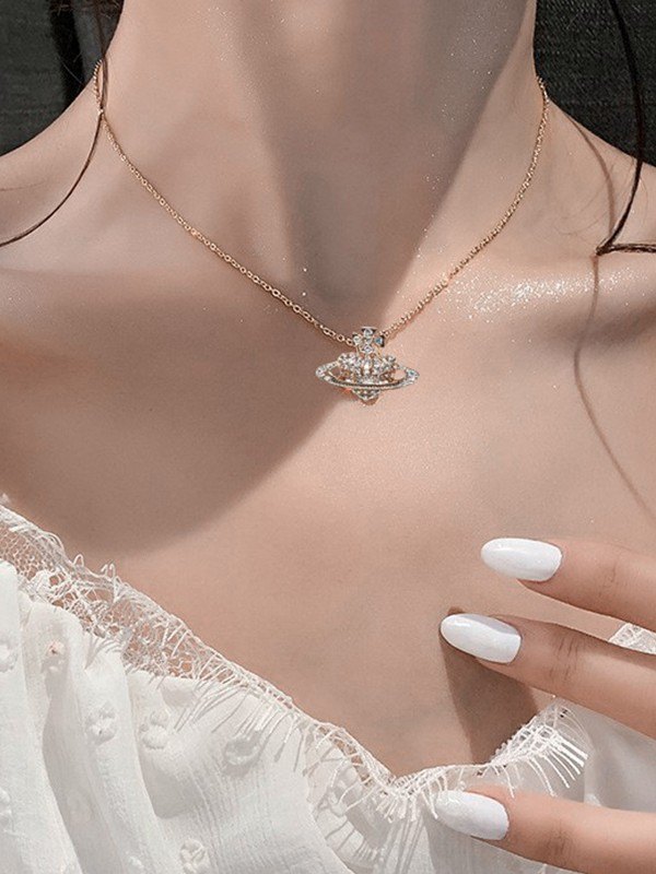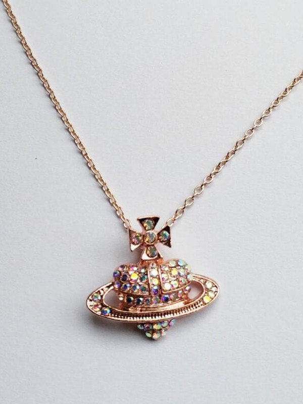 Rhinestone Heart Planet Charm Necklace
