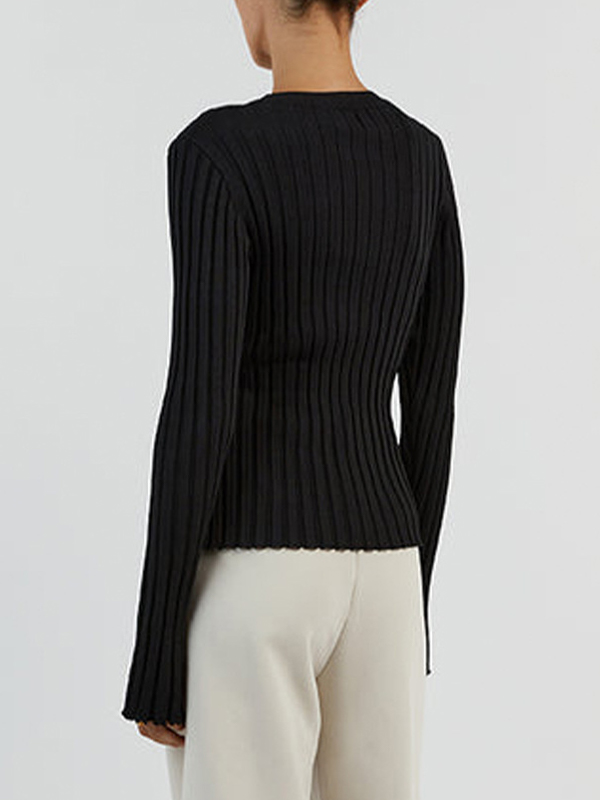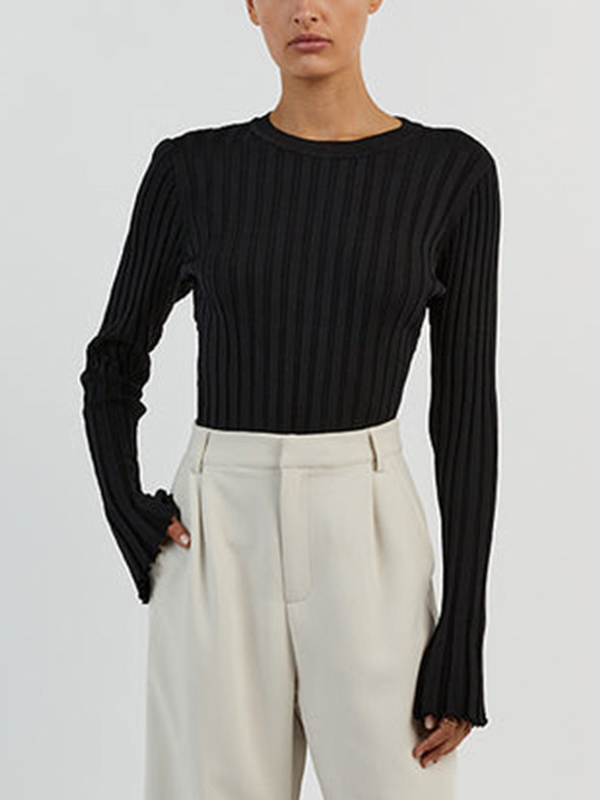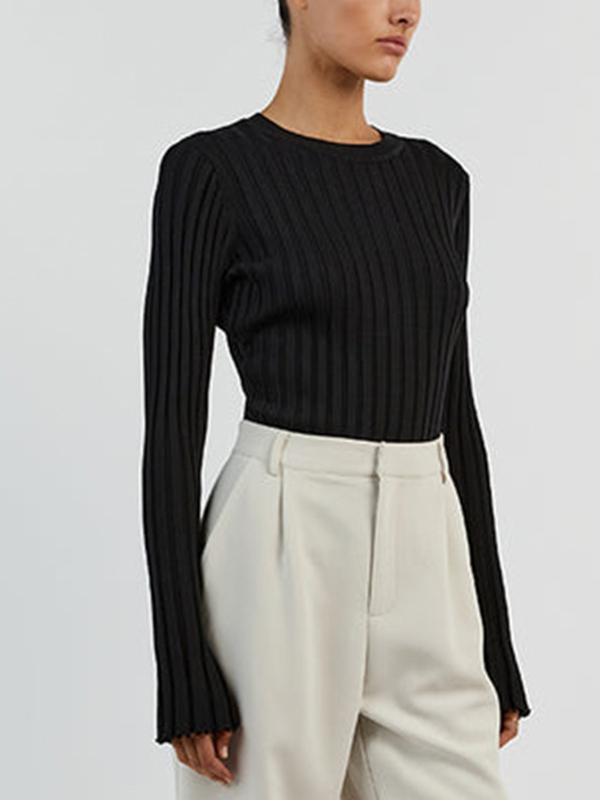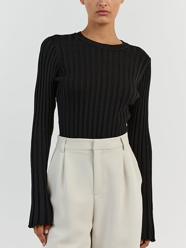 Solid Ribbed Crew Neck Long Sleeve Knit