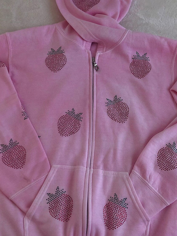 Strawberry Rhinestone Print Zip Up Oversized Hoodie