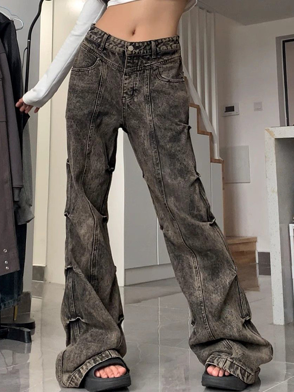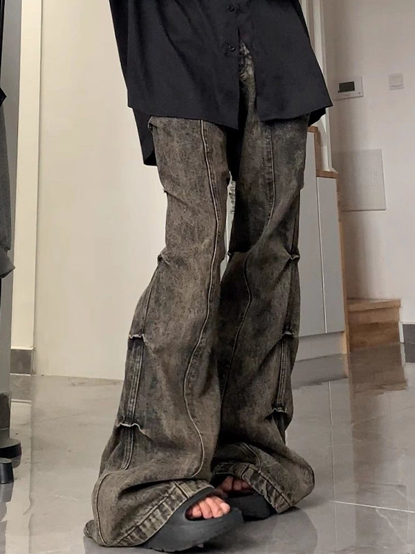 Wasteland Style Washed Pleats Slightly Flared Flare Jeans