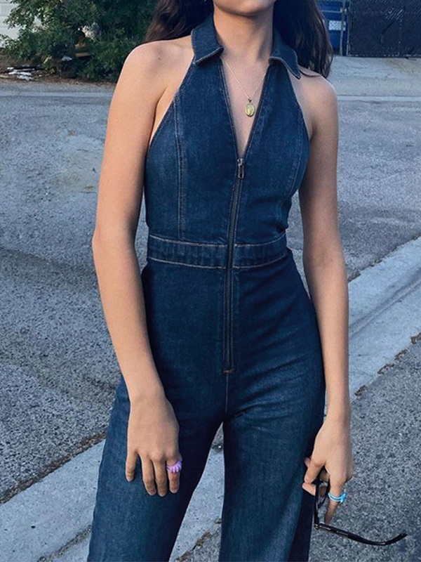 Lapel Neck Backless Zip Up High Rise Jumpsuits