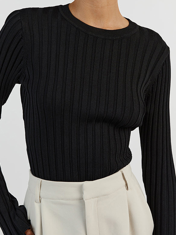 Solid Ribbed Crew Neck Long Sleeve Knit