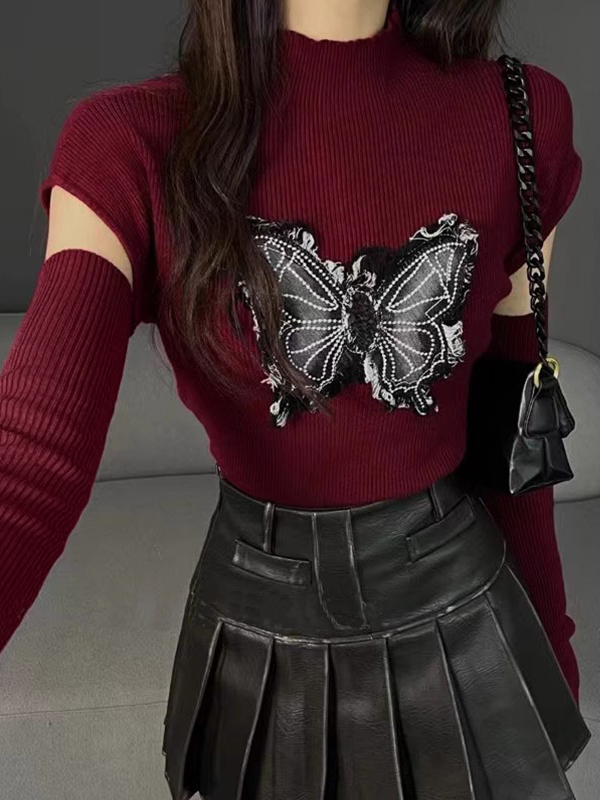 Butterfly Patch Mock Neck With Cuff Long Sleeve Knit