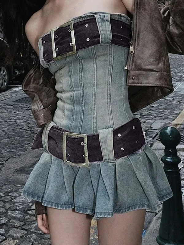 Vintage Denim Belted Bandeau Pleated Mini Dress