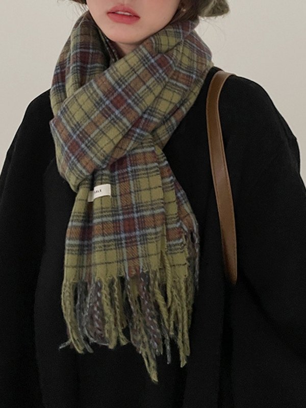 Vintage Green Checkered Fringed Scarf